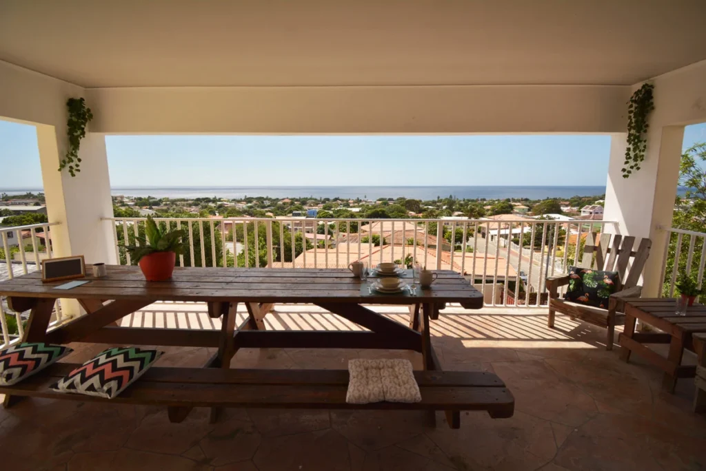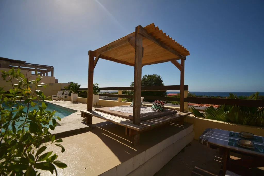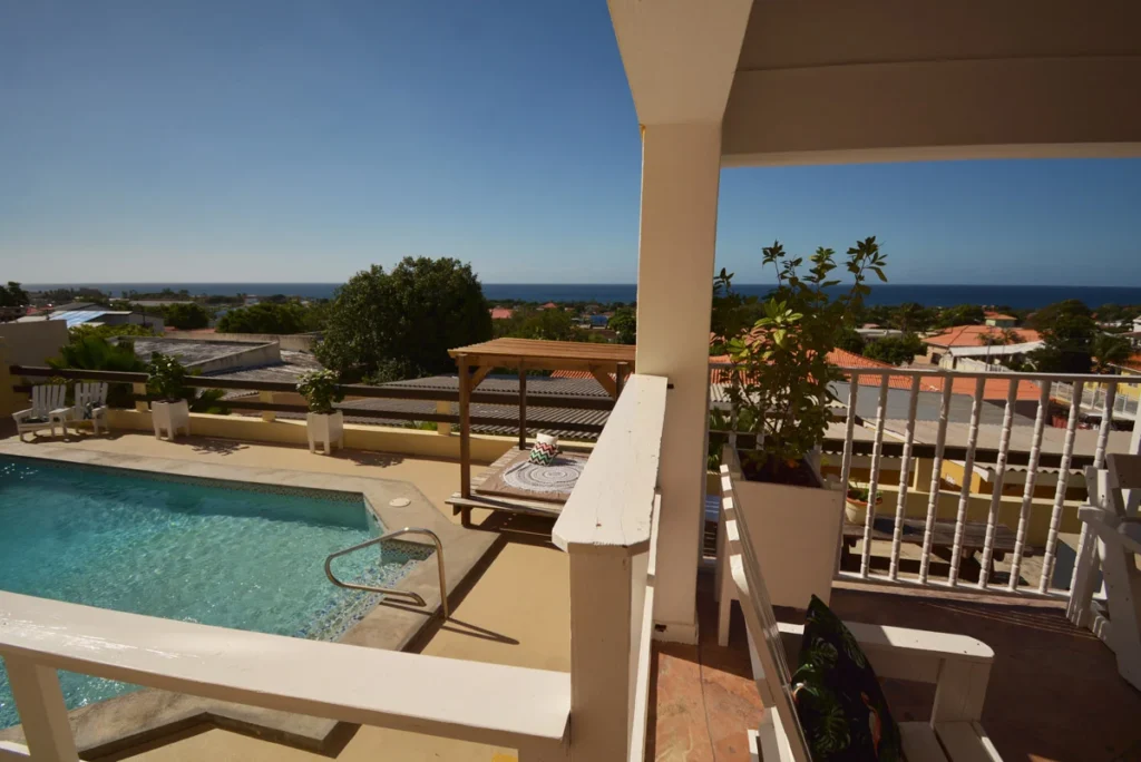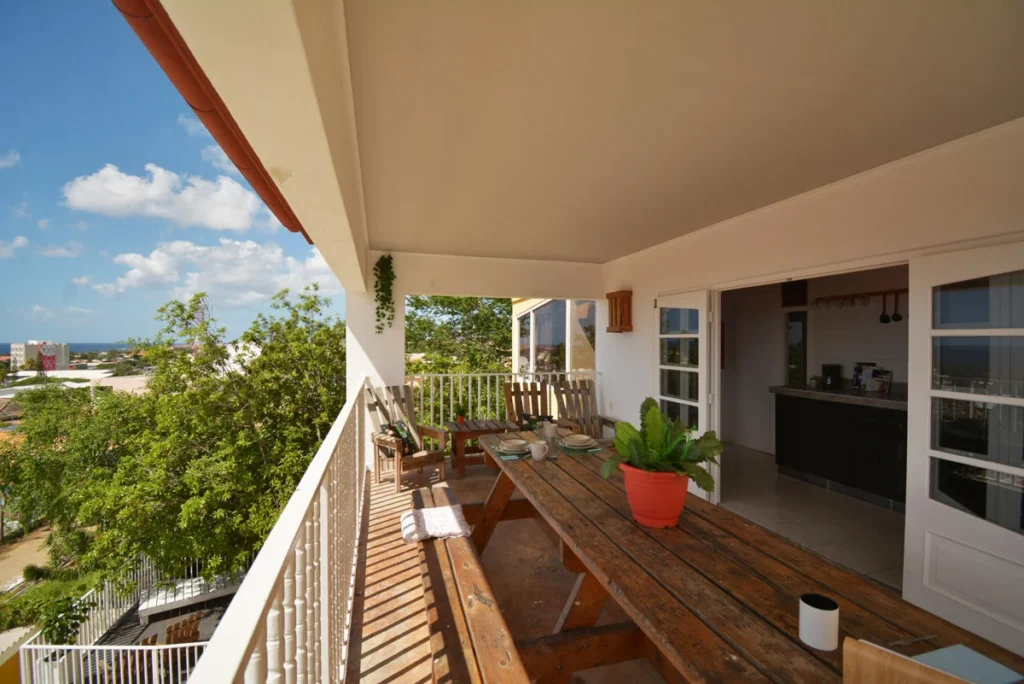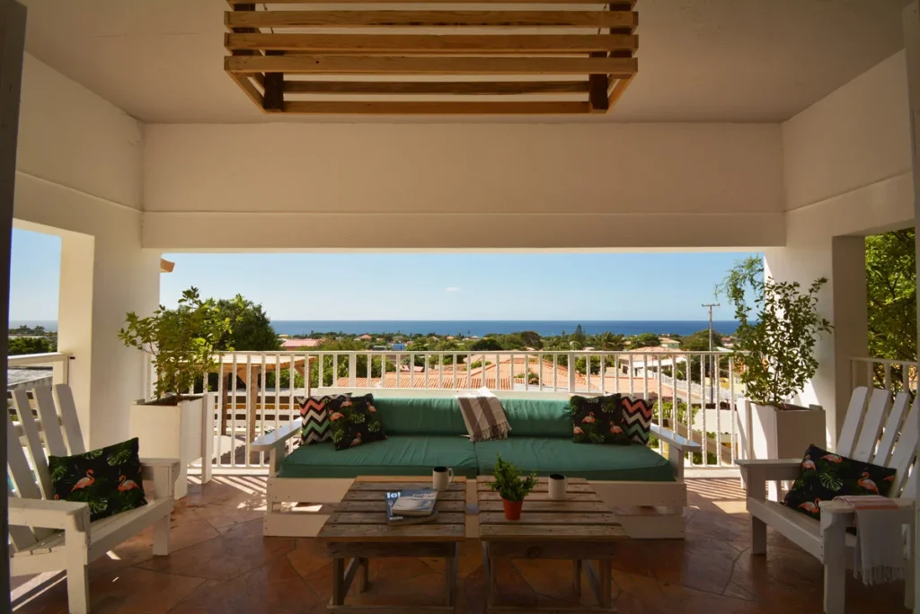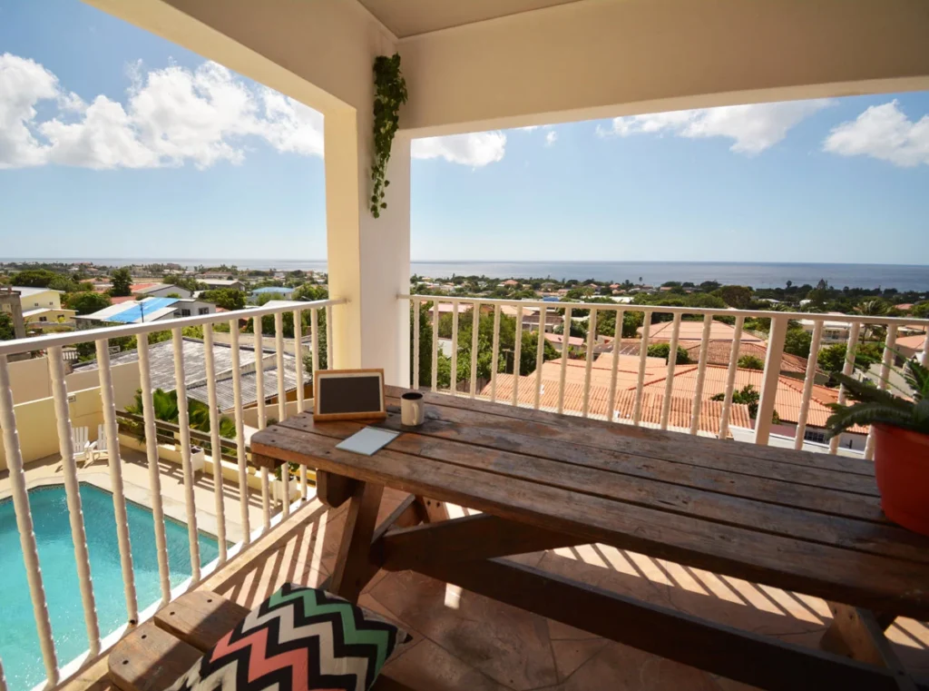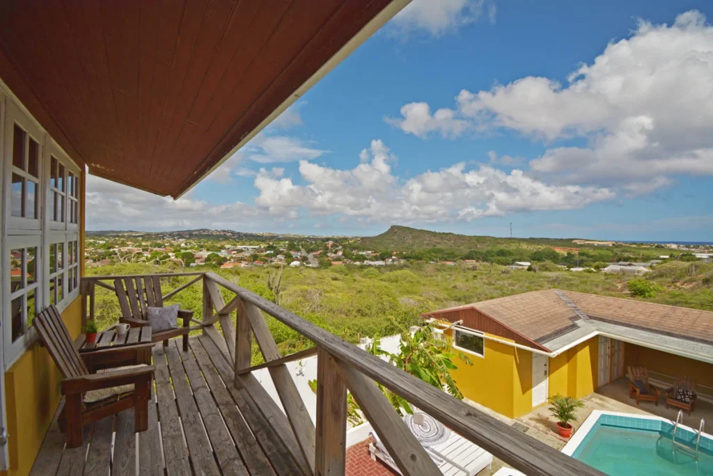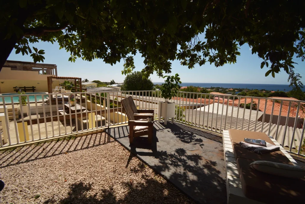 Op het balkon hebben we relaxte houten strandstoelen geplaatst. Hier geniet je van de opkomende zon en overzie je het gehele complex. In de verte kijk je op de Caribische zee en een mooi gedeelte van Curaçao.