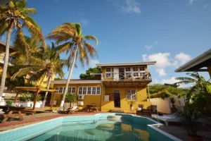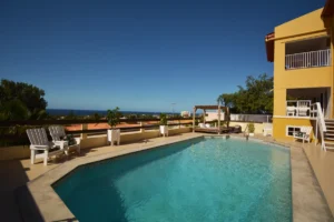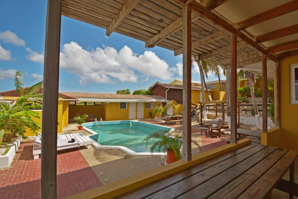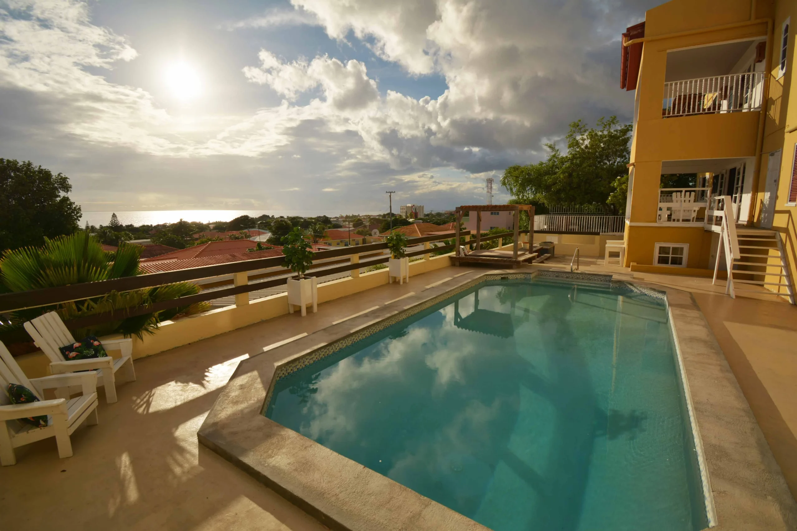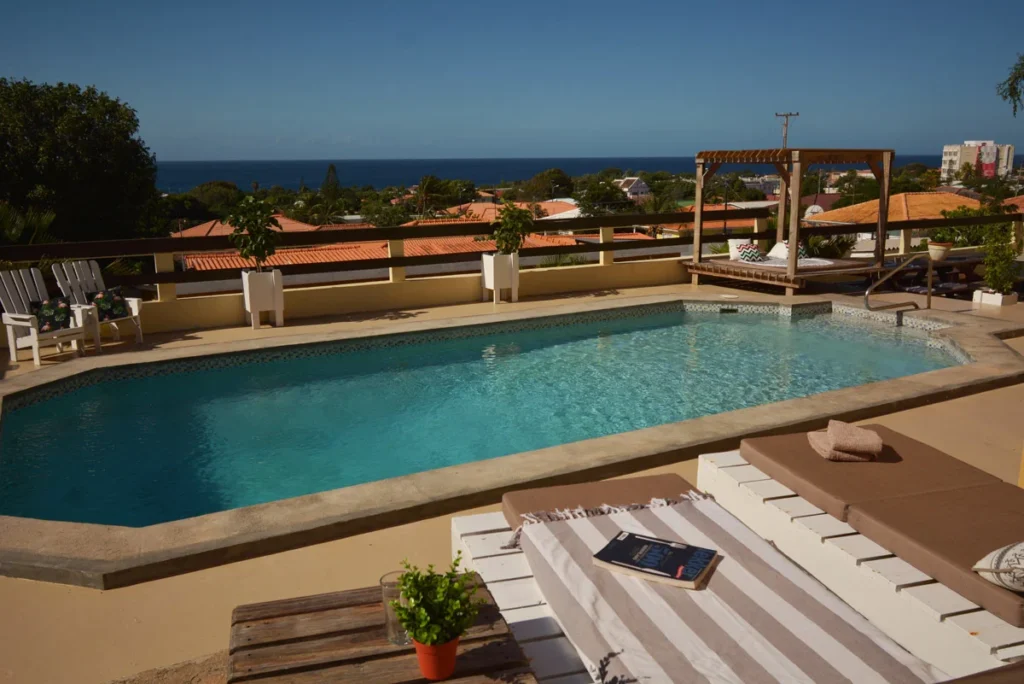 Aan de voorzijde van het complex tref je het gezamenlijke zwembad aan. Of je nu aan het zwemmen bent of aan het relaxen op één van de ligbedden, strandstoelen of ons loungebed je kijkt altijd naar de prachtige Caribische zee. Rondom het zwembad is voldoende meubilair en dit is tevens de plaats, naast de vele terrassen waar je je huisgenoten gaat ontmoeten. Het fijne van een zwembad bij je jongeren-/studentenhuis is dat je elke avond of ochtend even een verfrissende duik kunt maken en dat je ook niet altijd naar het strand hoeft wat weer veel extra kosten met zich meebrengt. Koop met elkaar wat biertjes en wijn en geniet van je dag aan het zwembad bij Villa Telamon 8.