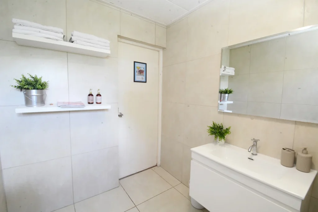 Dit drie-slaapkamerappartement is gelegen op de 1ste etage van het zogenaamde achterhuis bij Villa Telamon 43. Bij binnenkomst tref je de keuken aan en ook gelijk de badkamer, bestaande uit een douche, wasbak, spiegels en toilet.
