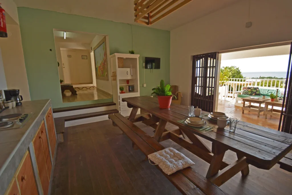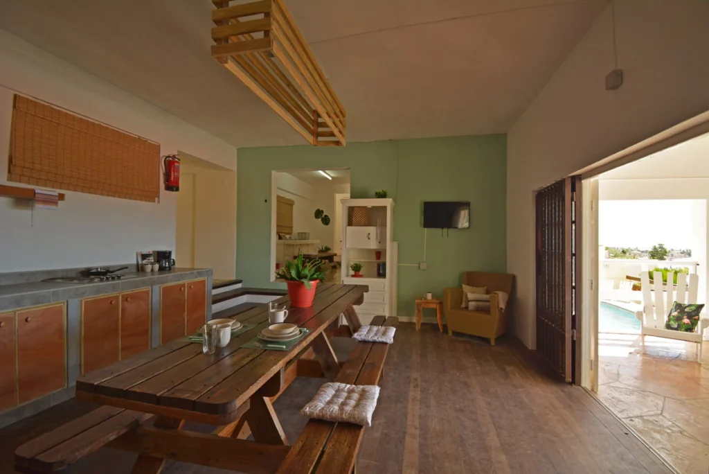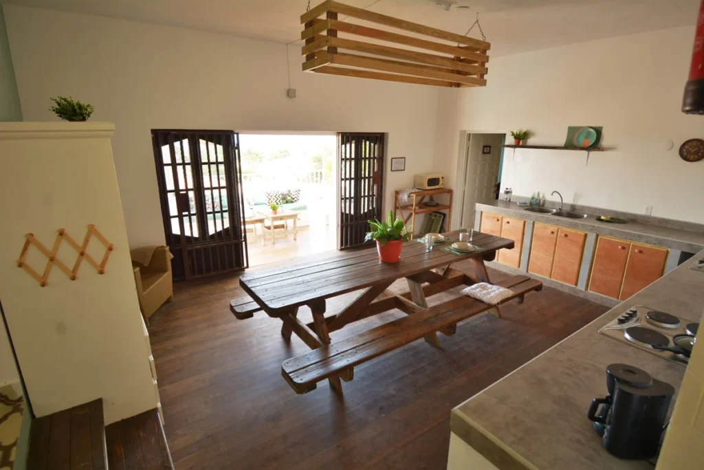 Uniek op Curaçao! Bij Villa Telamon 43 beschikken wij over een gezamenlijke woonkamer, werkruimte met bar. Hier kun je met elkaar gebruik van maken. Er is een grote tafel om te internetten, dineren of spelletjes te spelen. Er is muziek, een bar, een koelbox voor de koude drankjes welke je zelf mee mag nemen. Er zijn loungebanken, een boekenkast en een TV met een Google Chromecast zodat je al je favoriete series en films kunt streamen.
