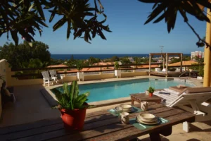 Bij Villa Telamon 43 jongeren- en studentencomplex tref je in het midden een groot zwembad aan. Rondom het zwembad zijn er ligbedden en houten strandstoelen aanwezig. Sinds kort beschikken wij ook over een hemelbed. Rondom het zwembad kun je met elkaar genieten van de warme dagen op het eiland. Hierdoor is het ook niet noodzakelijk om alle dagen op het strand te liggen waarmee je weer wat kosten bespaard aan drankjes, eten, ligbedden en entree.