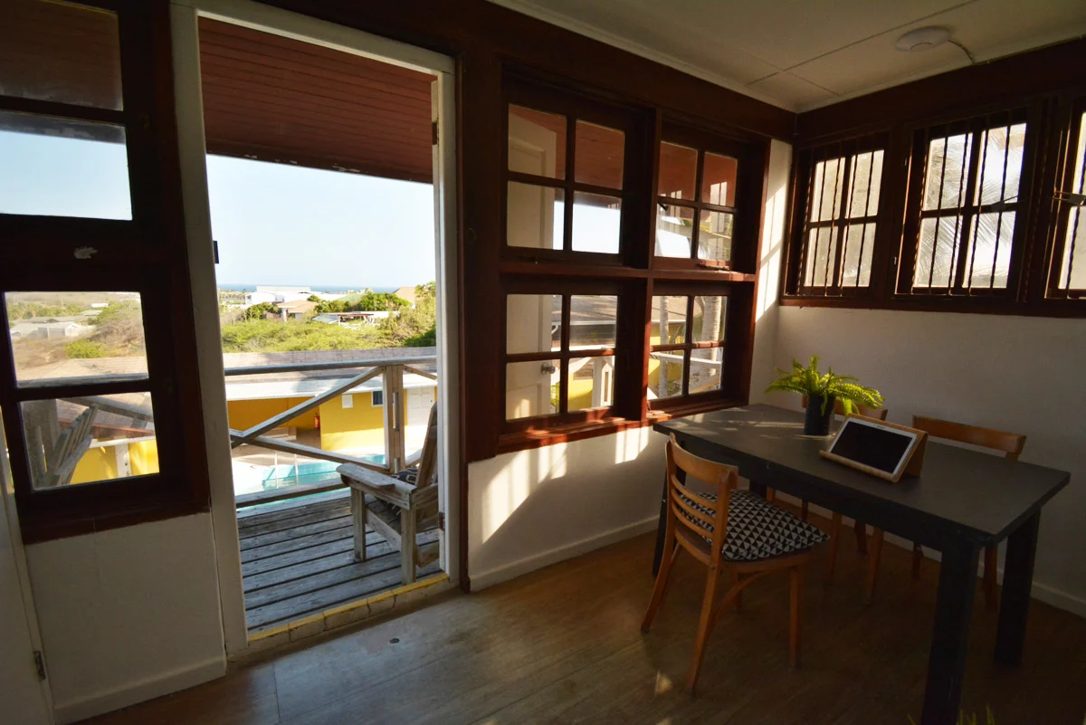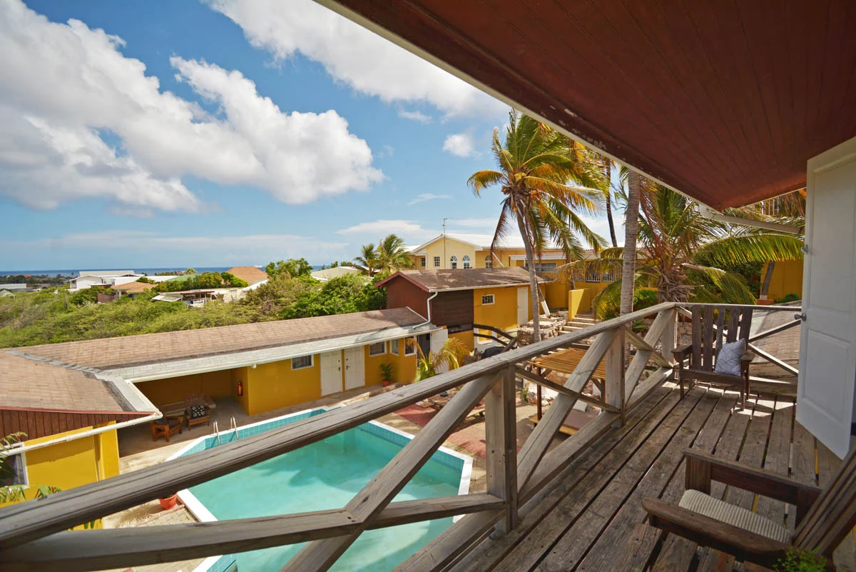 Op het balkon hebben we relaxte houten strandstoelen geplaatst. Hier geniet je van de opkomende zon en overzie je het gehele complex. In de verte kijk je op de Caribische zee en een mooi gedeelte van Curaçao.