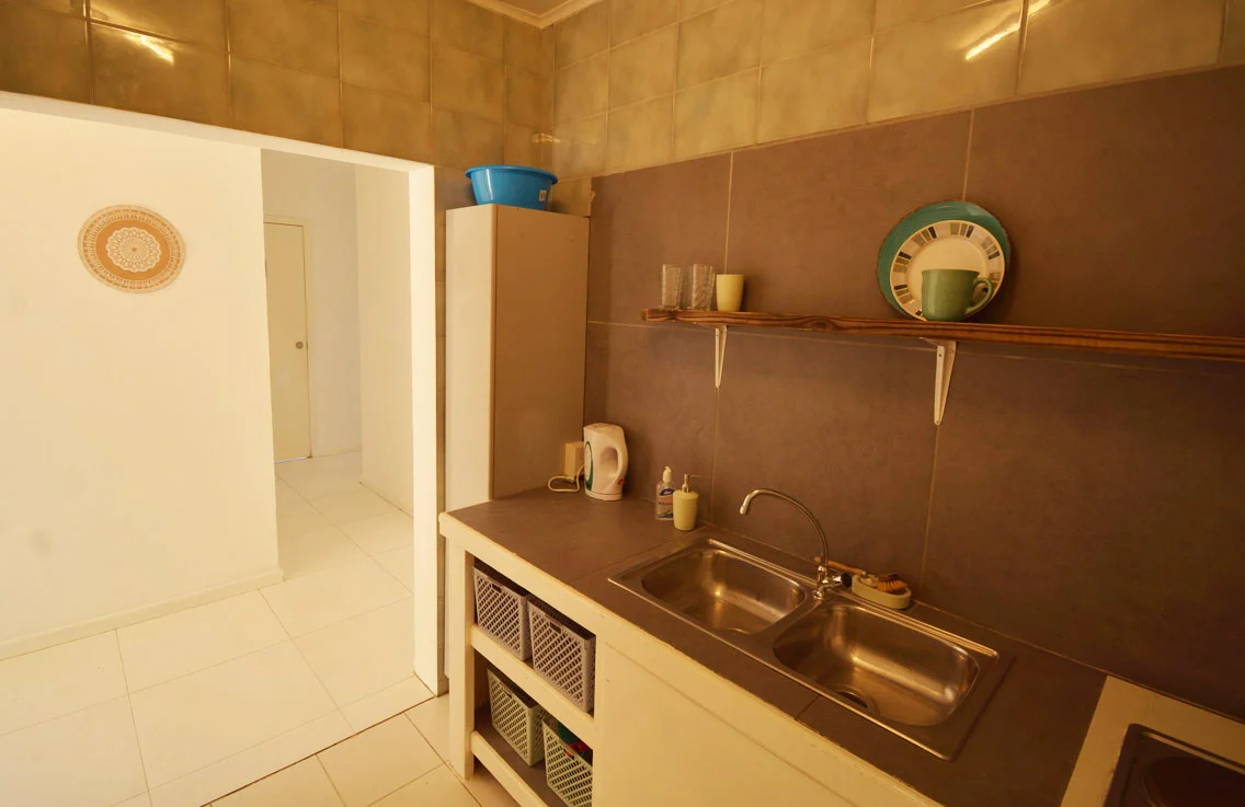 Dit drie-slaapkamerappartement is gelegen op de 1ste etage van het zogenaamde achterhuis bij Villa Telamon 43. Bij binnenkomst tref je de keuken aan en ook gelijk de badkamer, bestaande uit een douche, wasbak, spiegels en toilet.
